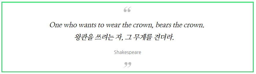 “왕관을 쓰려는 자, 그 무게를 견뎌라”. 영국의 대문호 셰익스피어가 권력에 집착하는 ‘헨리4세’를 꼬집고자 그의 희곡에서 한 말이다. 왕관을 쓴 자는 명예와 권력을 지녔지만 동시에 막중한 책임감이 따른다는 의미인데. 지난 2013년 인기리에 방영된 드라마 ‘상속자들’ 부제로도 유명세를 탔다.