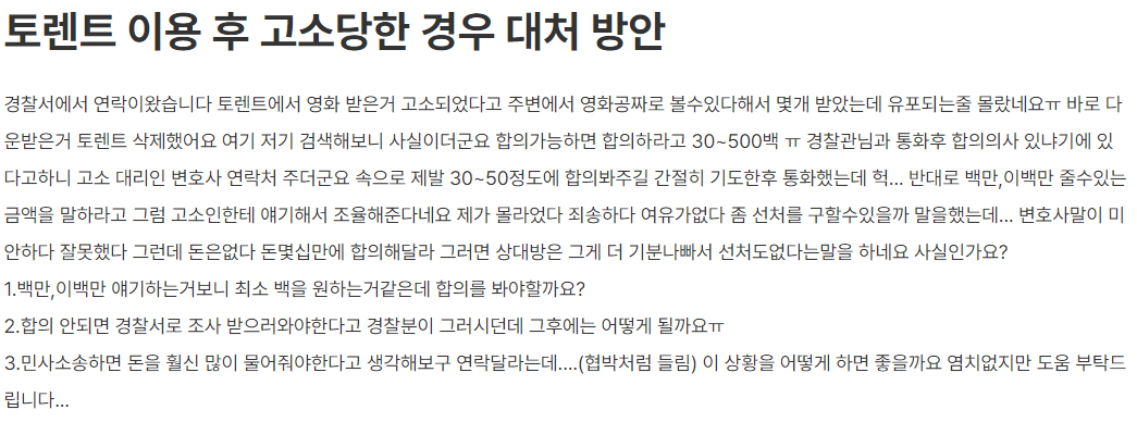 토렌트 고소와 합의에 대한 이야기였다.