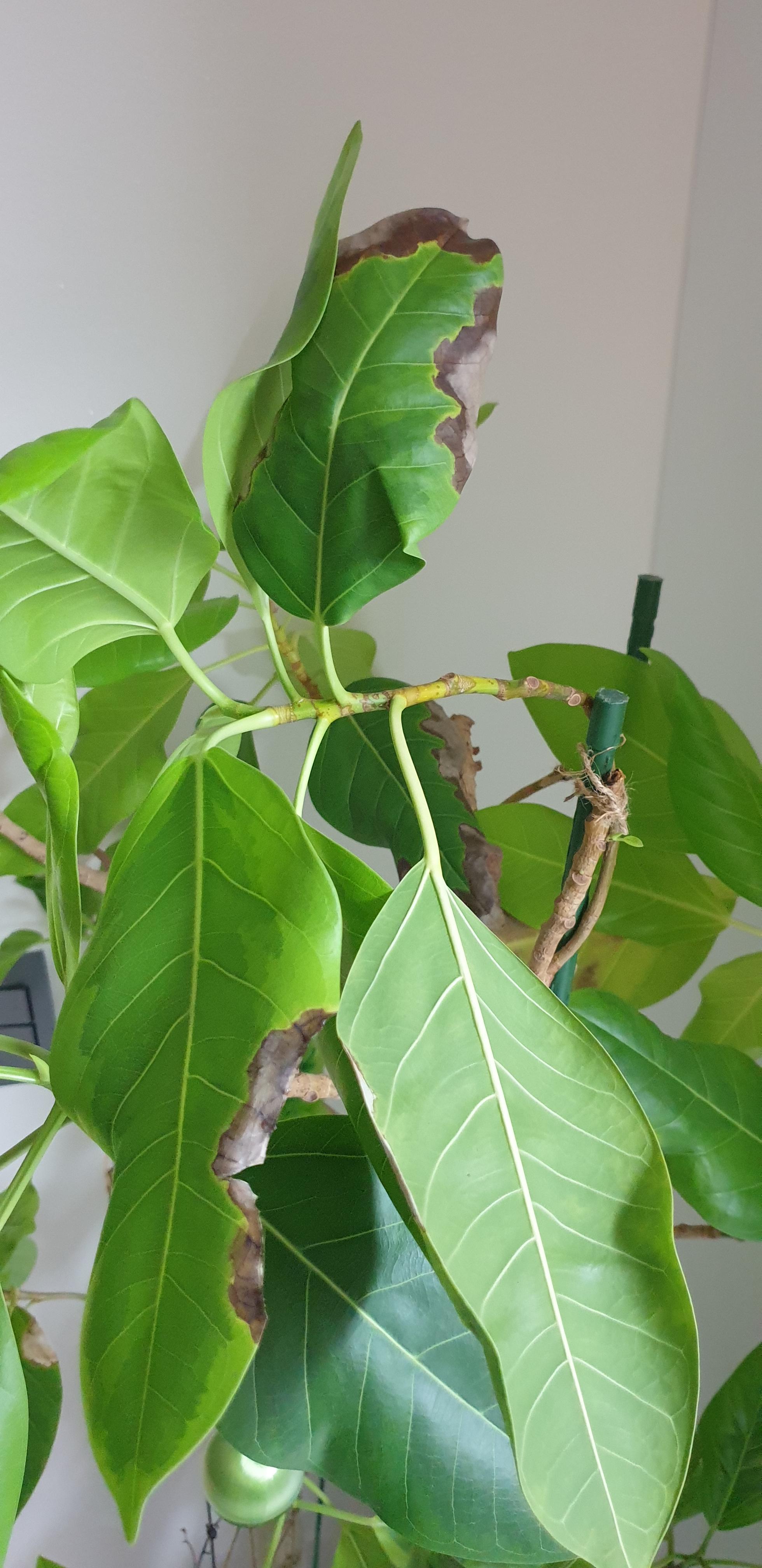 뱅갈고무나무 증상잎 가장자리가 검은색으로 변하고, 검은색으로 변한 부분에 일부 회색 빛 그러다 잎이 떨어지고갈색 목대 부분의 주름이 깊어짐 원인대표적인 과습 증상으로 화분 내부에