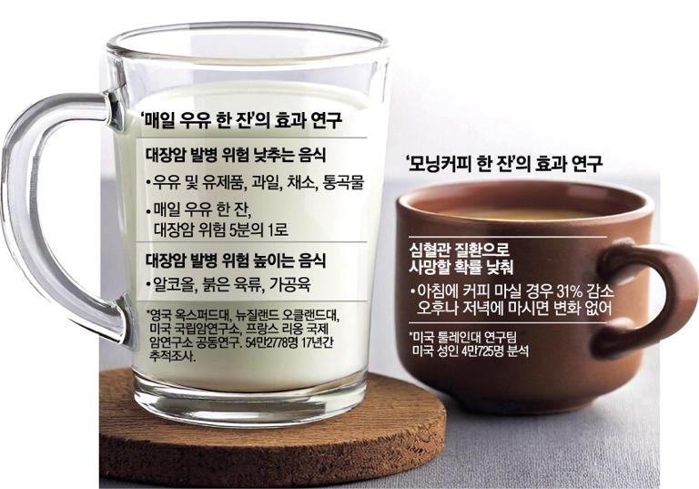 내 몸 지켜주는 '건강 한잔'매일 모닝커피 마신 그룹은심혈관질환 사망확률 31%↓글로벌연구팀, 54만명 조사매일 우유·두유 한잔 마시면대장암 발병위험 5분의1로 매일 한 잔 마시는 우유가 대장