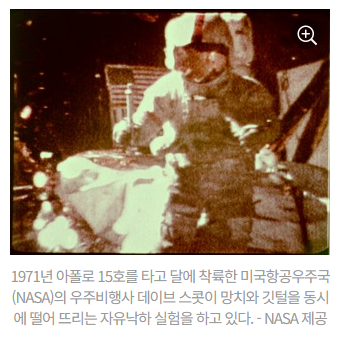 공기의 저항이 없다면 깃털과 돌맹이는 동시에 떨어진다.(갈릴레이의 피사의 사탑 실험의 유명한 사고실험)