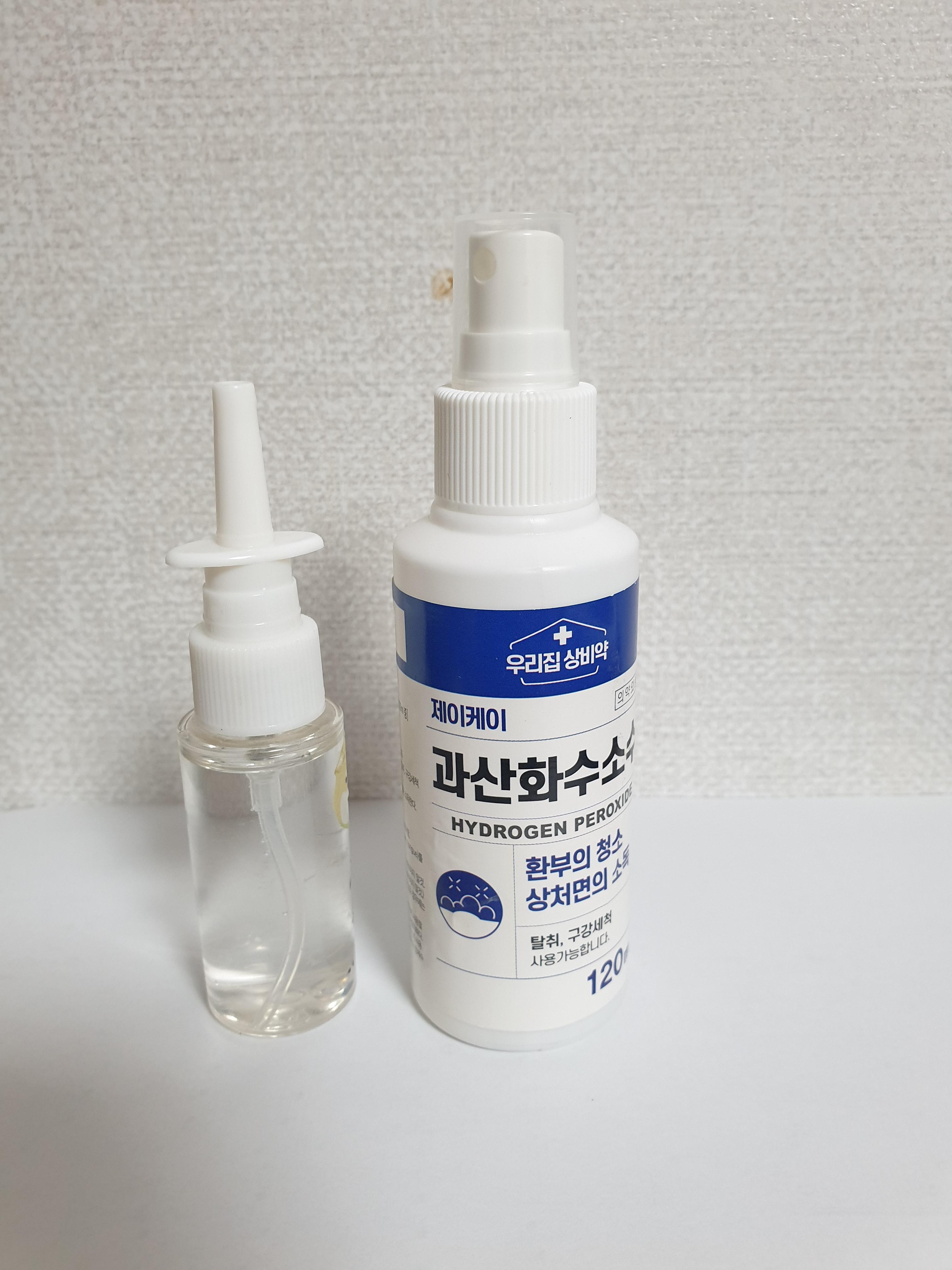 준비가 되면.. 스프레이통에 과산화수소를 1.5-2mm 정도만 조금 부어서 채운다. (이건 사용해 보고, 점막의 자극과 통증에 따라 조절이 필요하다)