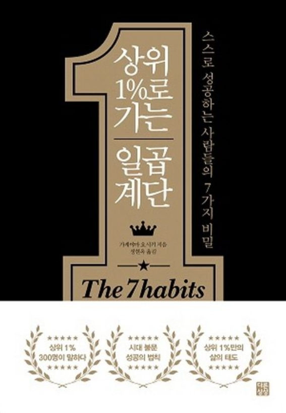 | 첫 번째 계단 : 배움- 언제든, 누구에게든 배운다 배움에 열정적인 이유 _ 21 / 타고난 능력보다 중요한 것 _ 25 /누구나 강점과 약점이 있다 _ 30 /사람에게 배우는 것이 제일이다 _ 33 **스스로 성공한 사람들이 배우기 잘했다고 생각하는 것들 _ 39 두 번째 계단 : 경험 - 살면서 겪는 모든 경험에서 의미를 찾아낸다 좌절이나 실패 없는 성공은 없다 _ 44 / 쉽게 포기하지 않는다 _ 48 / 주는 사람이 성공한다 _ 53 / 고민은 해도 절망은 하지 않는다 _ 57 / 우연을 그냥 지나치지 않는다 _ 63 세 번째 계단 : 습관- 자기만의 규칙을 정하고 습관화한다 사소한 습관이 성공을 부른다 _ 70 / 언제나 자기 관리는 필수다 _ 75 / 잘 풀리지 않는다면 기본에 충실하라 _ 79 / 그들의 시간 개념엔 특별한 게 있다 _ 83 / 피할 수 없는 회식, 나만의 규칙 _ 88 / 목표를 이루고 싶다면 혼자가 되라 _ 94 / 미래 지향적으로 생각하라 _ 97 네 번째 계단 : 운- 운을 중요하게 여긴다 운을 끌어당겨라 _ 105 / 준비와 결단 그리고 운 _ 108 / 운이 좋은 사람과 어울린다 _ 115 / 절대 기회를 놓치지 않는다 _ 118 **자기 힘으로 상위 1%가 되는 사람의 운과 관련된 행동 _ 123 다섯 번째 계단 : 끈기- 시행착오 속에서 새로운 가치를 발견한다 끊임없이 시행착오를 반복한다 _ 129 / 주어진 대로 살지 않는다 _ 133 / 성공한 사람은 멀티태스킹에 능하다 _ 138 / “맞바람은 당연히 불어온다” _ 141 / 일의 가치를 나눠라 _ 147 여섯 번째 계단 : 목적의식- 불필요한 일은 하지 않는다 과거로 돌아가고 싶은가요? _ 155 / 성공한 사람은 성공한 사람을 끌어당긴다 _ 158 / 목표가 아닌 목적을 찾아라 _ 163 / 강한 의지는 어디서 오는가 _ 169 / 미련 없이 버릴 줄 알아야 채워진다 _ 173 / 융통성과 완고함 _ 179 일곱 번째 계단 : 직감- 논리보다 직감으로 판단한다 ‘왠지’에 민감하다 _ 189 / 직감과 논리를 자유롭게 사용한다 _ 192 / 자기 자신과 대화하는 시간 _ 197 / 자신의 한계를 파악하라 _ 201 / 양쪽 뇌를 사용한다 _ 205 에필로그 | 빛나는 인생을 위한 삶의 태도 나의 존재 가치를 찾아라 _ 210 / 자기 관리에 능한 사람이 성공한다 _ 214 / 돈보다 더욱 중요한 것 _ 219 직장 생활 요령보다 개인 기술을 개발하라 _ 224 / 아군, 적군 가리지 않고 동료는 많을수록 좋다 _ 229 **이런 사람이 성공한다! _ 233 |