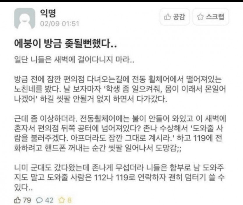| [레벨:5]잔돈없어요 2021.03.11 아직도 기억난다 20살 초반때 사람도 드문 늦은밤에 종로5가 지하철역 근처에서 어느 50후반의 할줌마가 있었음 근데 나를 보더니 자기가 콜택시를 불렀는데 위치를 못찾는다고 나보고 전화로 대신좀 알려달라고 하더라고 맘속으로 아니 뭔 택시가 길을 못찾나 싶었지만 꽤나 부탁을 하시길래 할줌마가 건넨 전화를 받았는데 위치가 딱 종로5가 지하철역 4번 출구 였었거든 그래서 전화로 기사님 여기 4번출구다 이쪽으로 오면 된다 하는데 계속 본인은 모르겠다는거야 그러니 자기가 위치를 알려줄테니 그리로 오라고 계속 유도를 하대? 그때 갑자기 뭔가 느낌이 너무너무 쎄한거야 그때 얼른 폰 건네면서 어떻게 기사가 모르냐고 거짓말 말라고 난 간다고 하니까 그때 할줌마 표정이 '에이 씨발....' 이렇게 말하는 표정으로 굳어지면서 노려보더라? 그거보고 진짜 냅다 존나 뛰었음 아직도 그 섬찟함을 잊지 못하겠음 |
