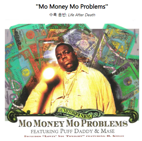 ![]() (리프레인 Refrain..만 발췌) 응, 응, 응 Yeah, yeah, yeah 그 사람들이 나한테 뭘 원하는지 모르겠어 I don't know what they want from me 마치 우리가 더 많은 돈을 접할수록 It's like the more money we come across 문제가 많아질수록 The more problems we see 그 사람들이 나한테 뭘 원하는지 모르겠어 I don't know what they want from me It's like the more money we come across (uh) The more problems we see (uh) .... Mo Money Mo Problems = More money, more problems. & 식자우환(識字憂患) |