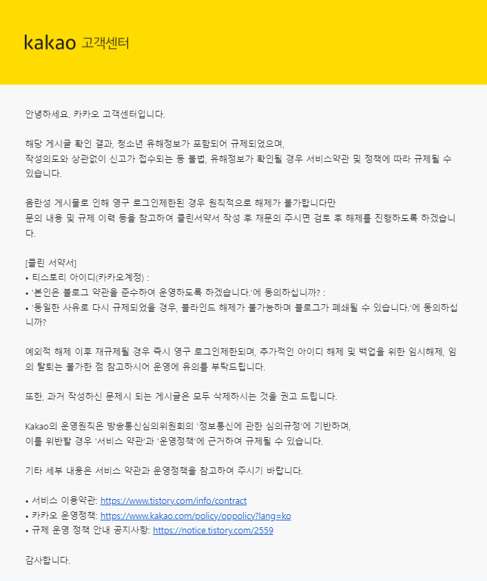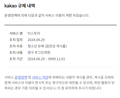 4월 29일 문제글 삭제와 동시에 티스토리 계정차단.