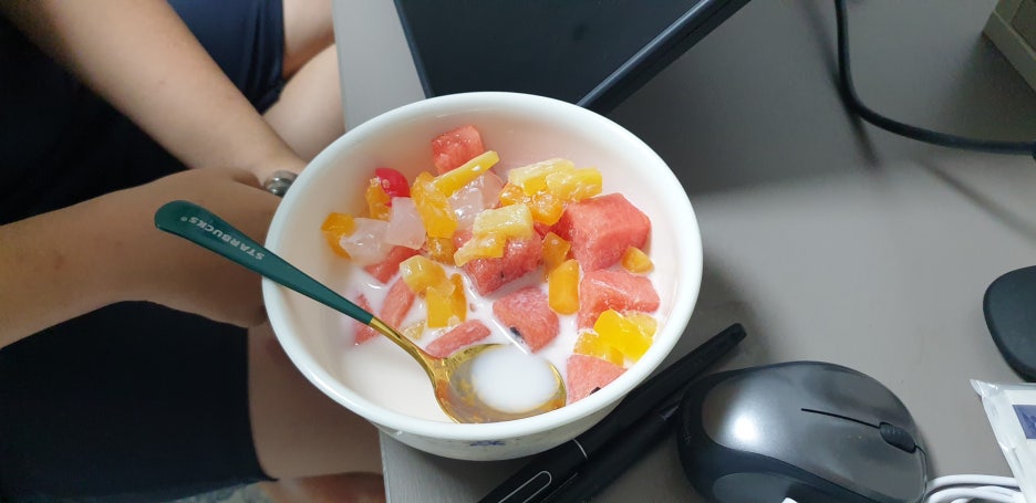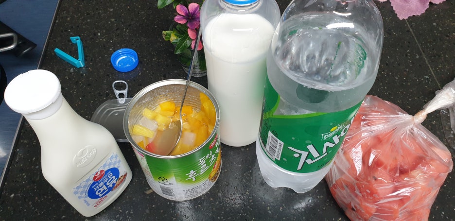 레시피는 국그릇만큼의 수박 + 후르츠 칵테일 통조림 + (얼음).. 에다가..