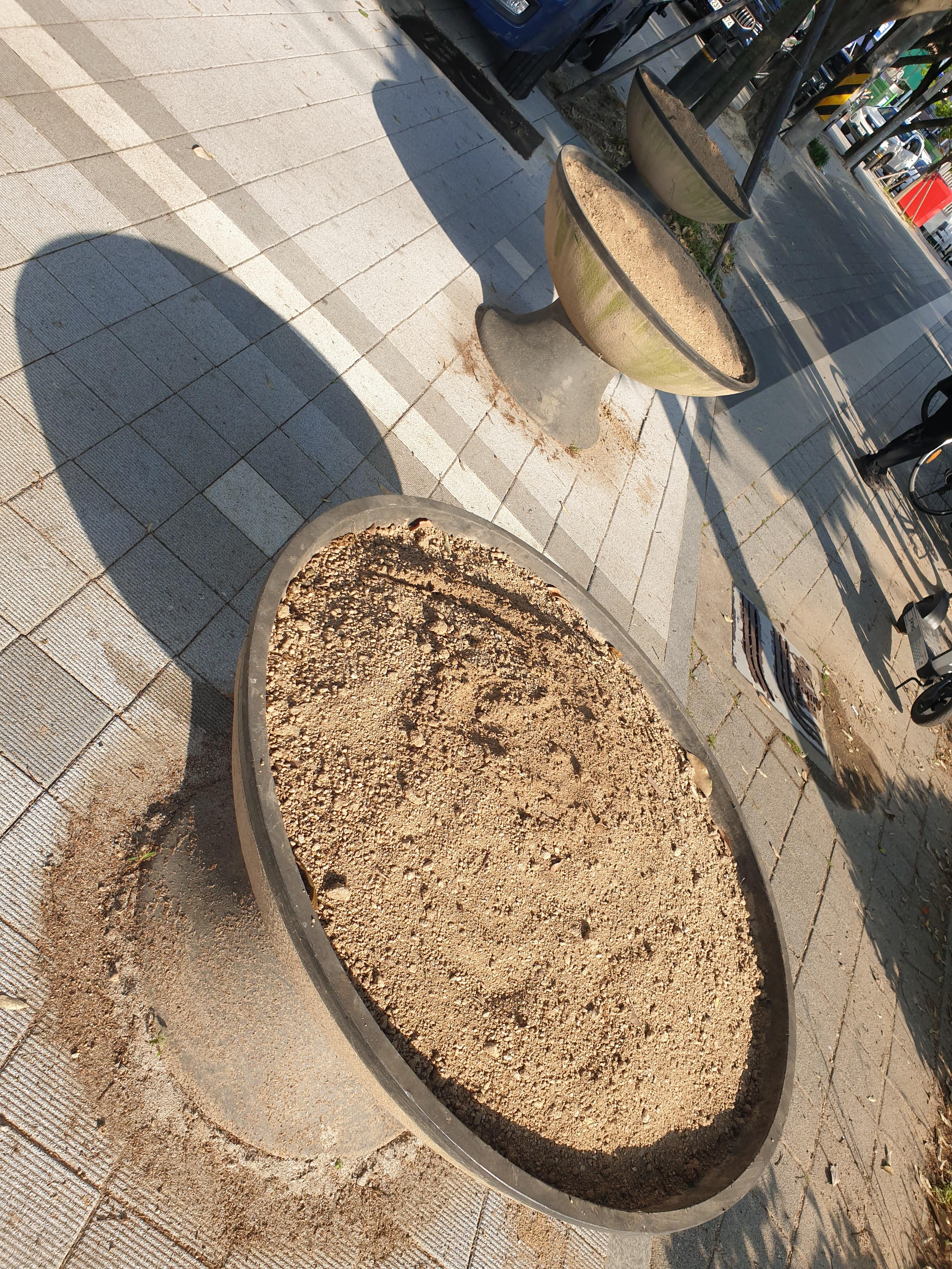 출근길의 보도 위엔... 불법 주정차나 노점을 방지할 목적의 커다란 접시 같은.. 화분이 여럿 있다..