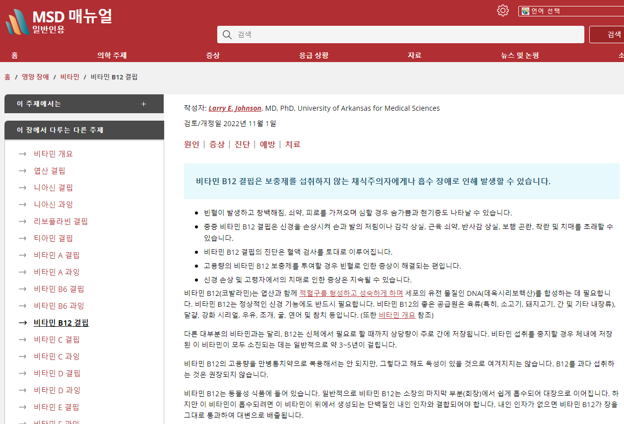 비타민 B12 결핍 - 영양 장애 - MSD 매뉴얼 - 일반인용
