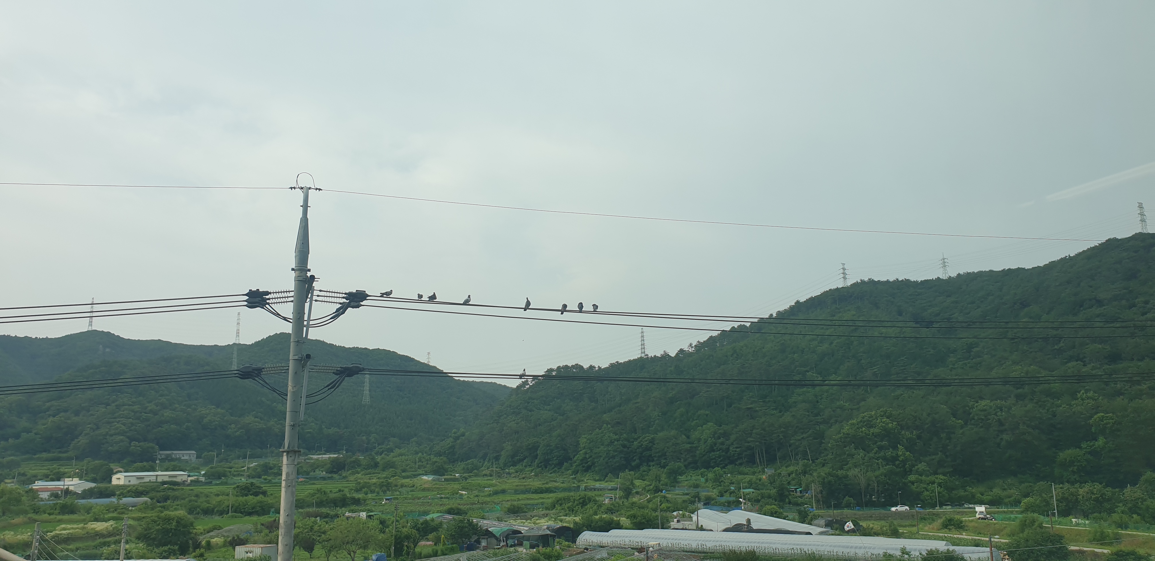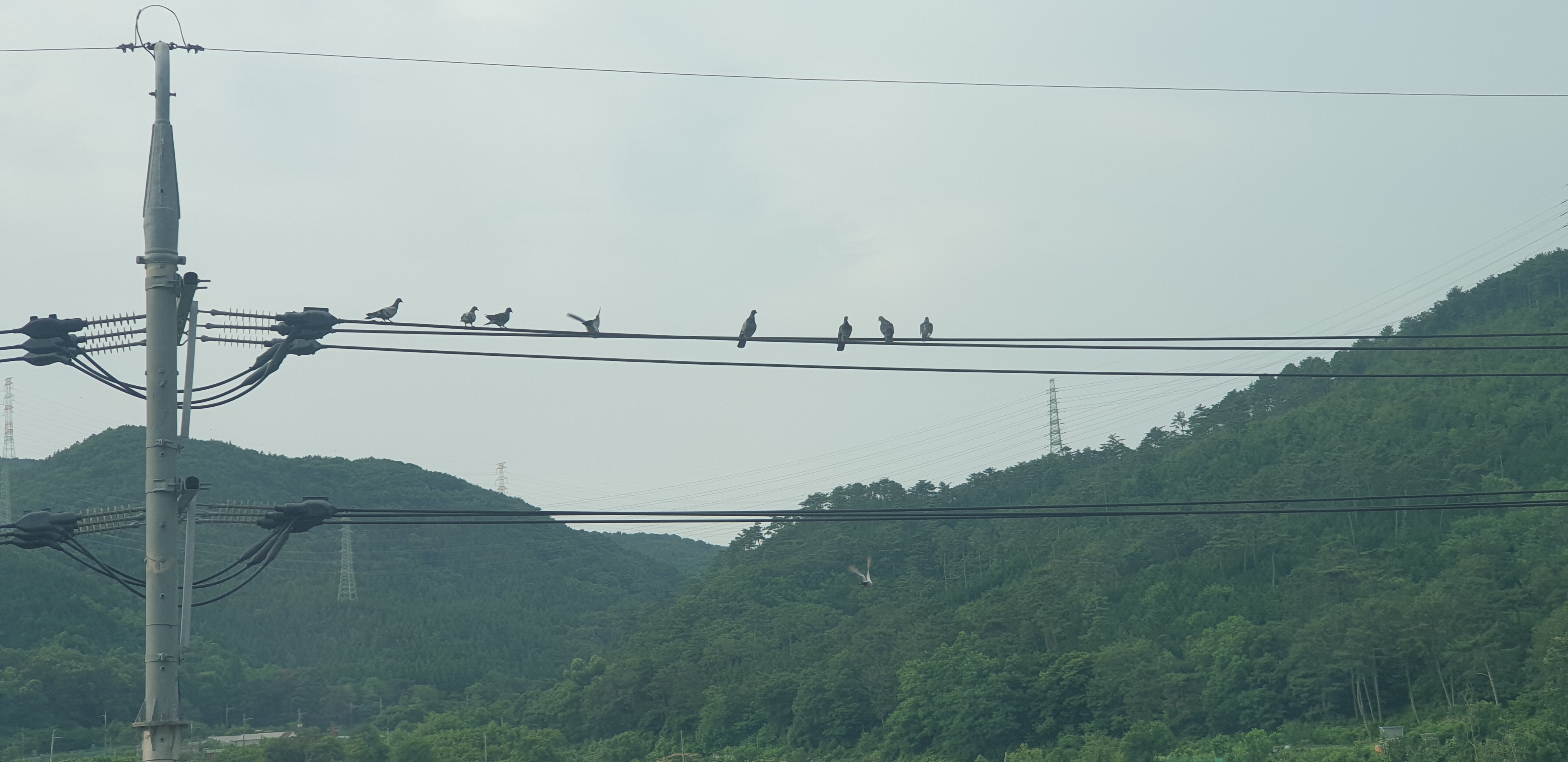 출근길에.. 역 옆의 전선에 비둘기 무리가 가득한데..
