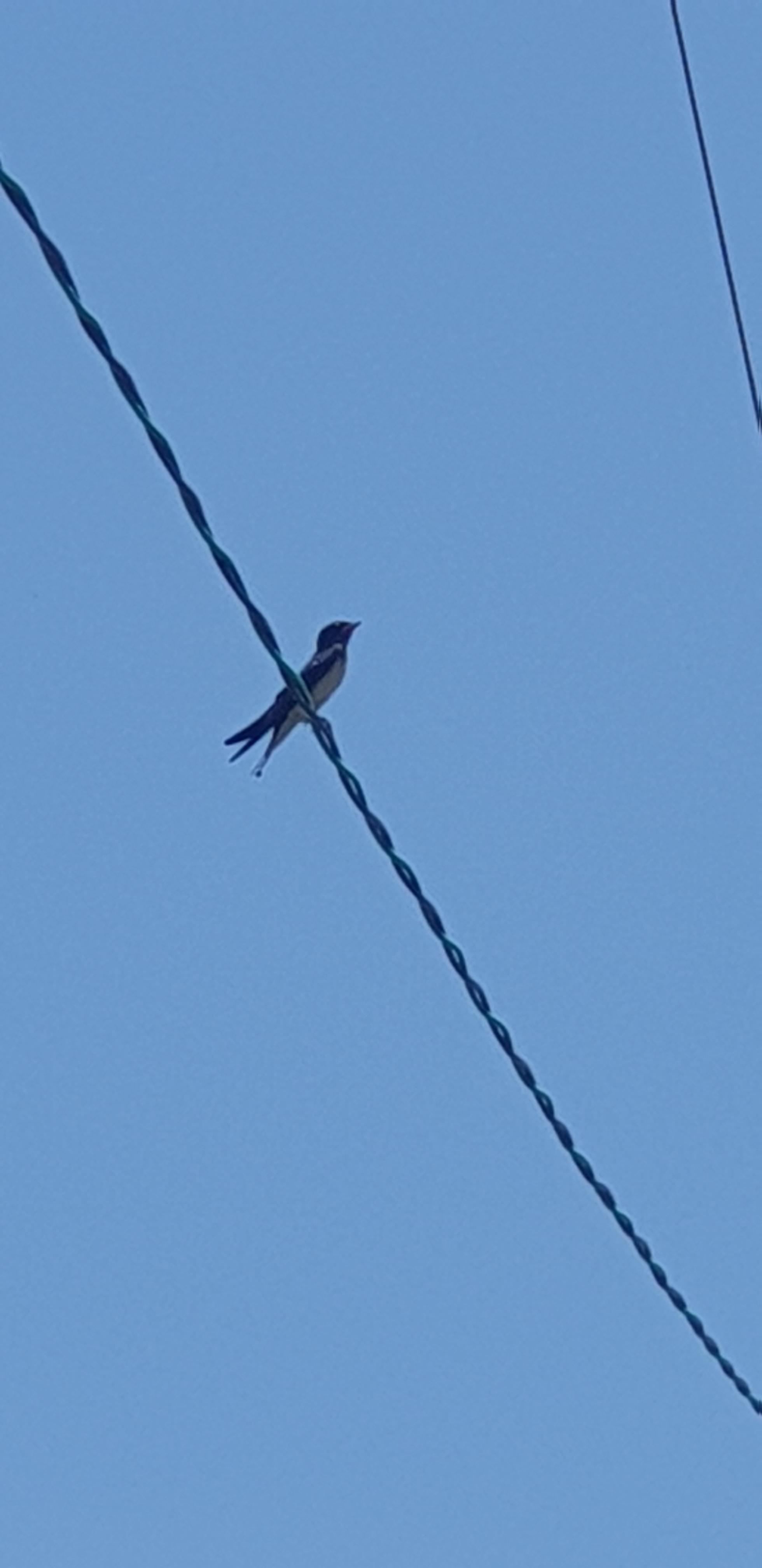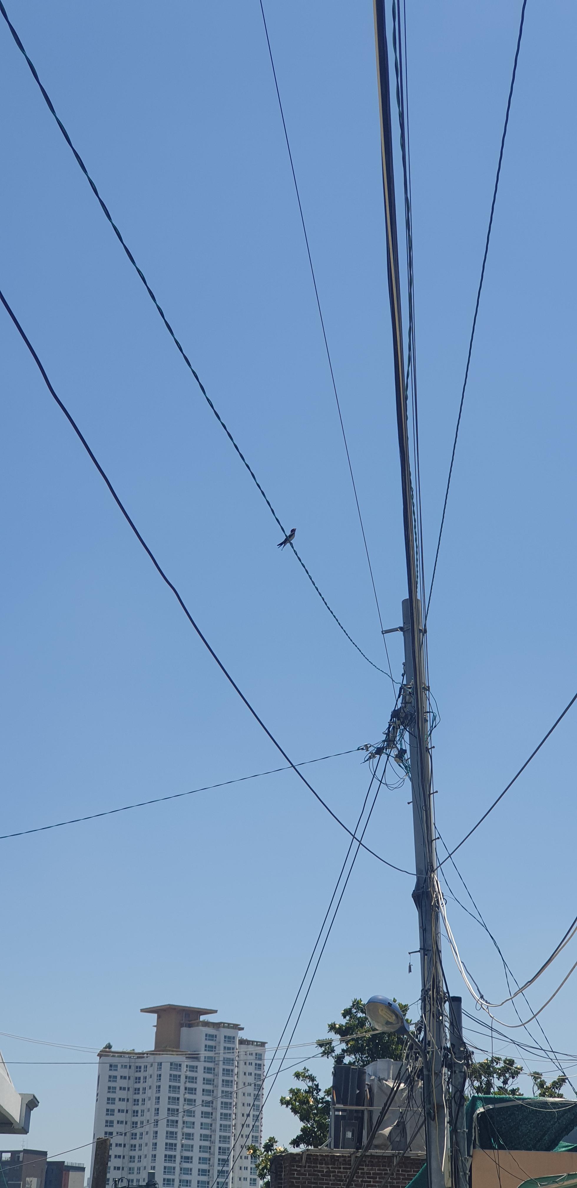 전선에 홀로 제비가 앉아 있다.