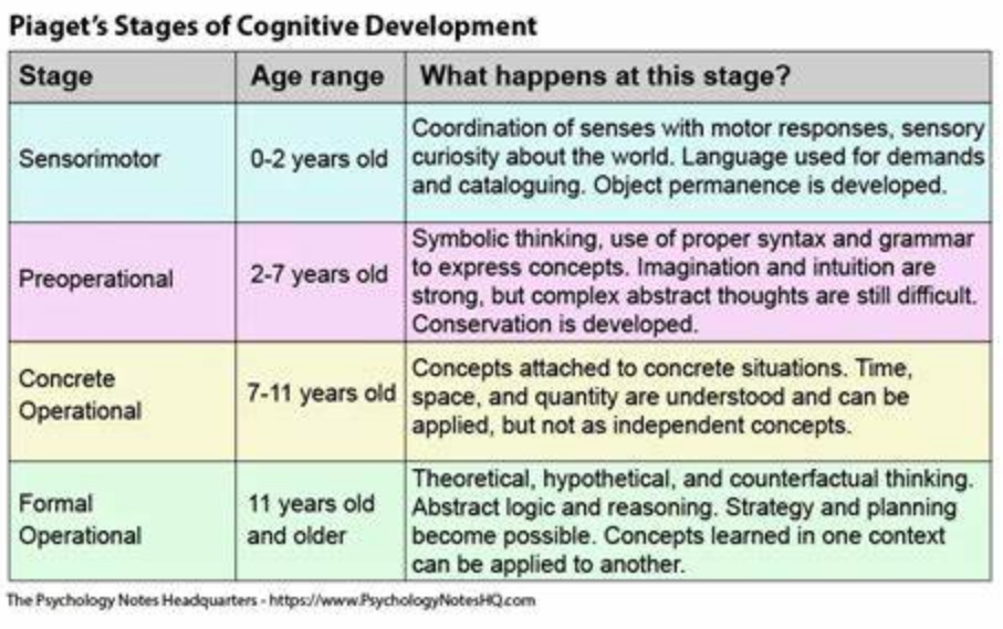 피아제의 인지발달 이론에 따르면, 인지발달 과정은 감각운동기, 전조작기, 구체적 조작기, 형식적 조작기 4단계로 구분된다. 4단계의 인지발달은 개인의 지능이나 사회 환경에 따라 각 단계에 도달하는 개인 간 연령의 차이는 있을 수 있으나, 발달 순서는 결코 뒤바뀌지 않는다고 가정하고 있다. 또한 각 단계는 주요 행동양식으로 설명될 수 있는 전체적인 심리구조로 특징 지워진다. 각 단계는 전 단계의 심리적 구조가 통합된 것이며, 다음 단계의 심리적 구조로 통합되기 위한 준비과정이기도 하다. 즉, 각 단계의 사고과정은 서로 다르며 시간이 경과함에 따라 더욱 복잡하고 객관적이며 타인의 관점을 생각하는 방향으로 발전하게 된다.
