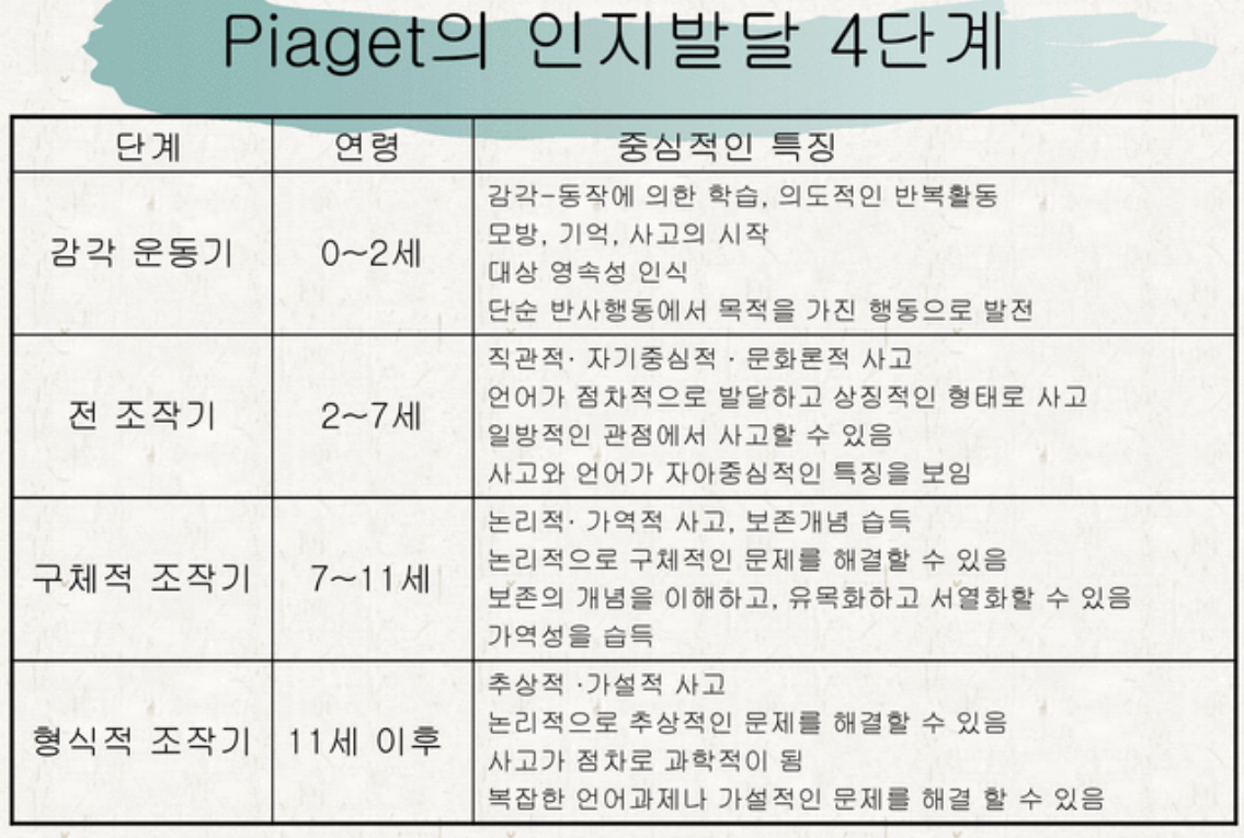 일단.. 피아제의 인지발달 4단계를 살펴보자.
