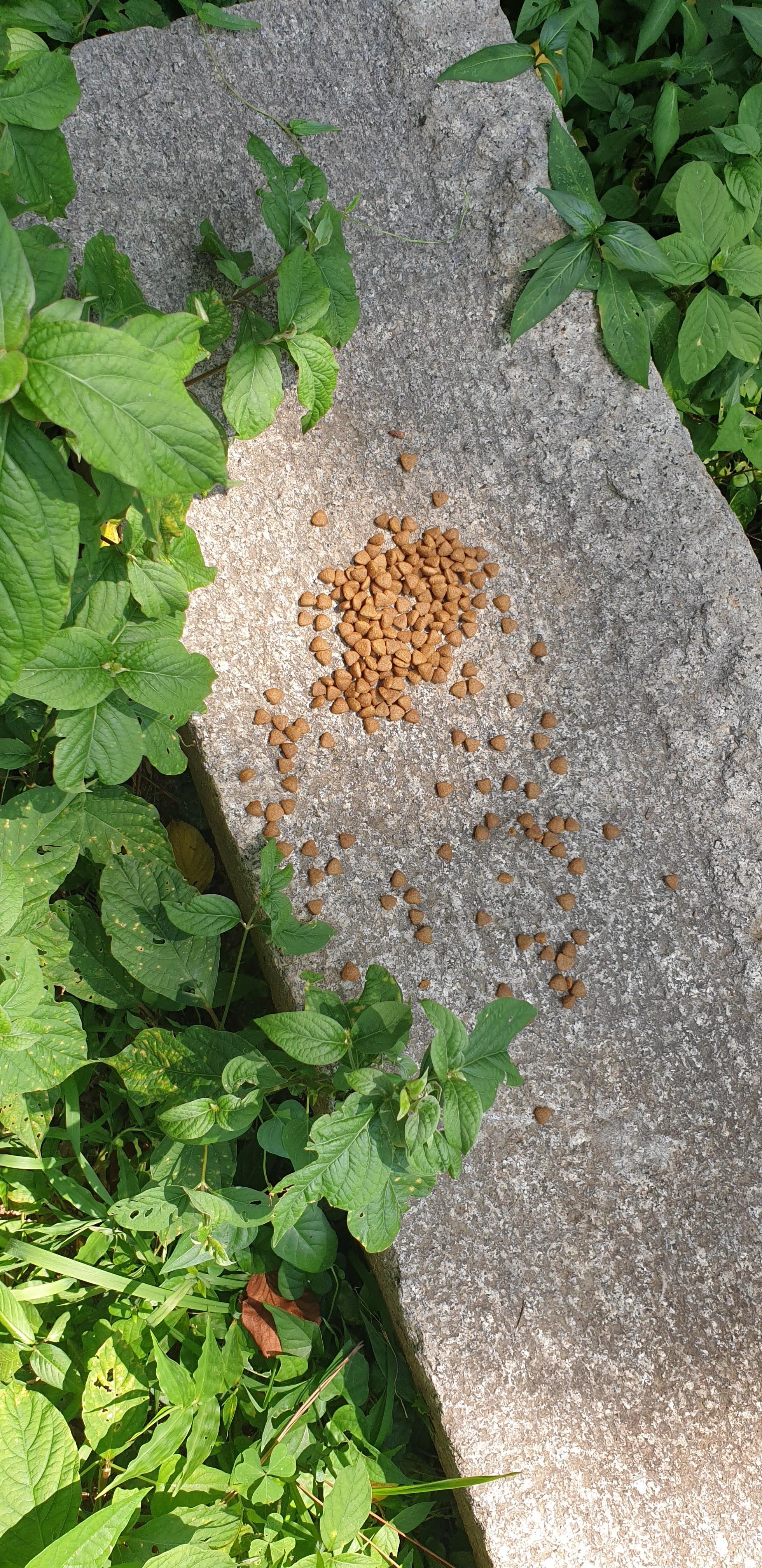 어느 날 보니, 정말로 희고 누런 얼룩이 있는.. 인상이 사나운 녀석이 어느새 나타나서 남은 먹이를 먹고 있는 것도 봤다.
