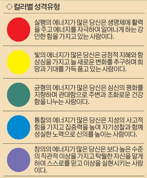 색상별 성격유형을 보면 ▷빨간색은 적극적이고 진취적이지만 충동적이며 자기중심적이고 ▷노란색은 밝고 사교적이지만 비논리적이고 유아적인 경향이 있다. ▷초록색은 모범적이고 책임감 있지만 인색하고 냉담하며 ▷파란색은 안정적이며 신뢰감을 주지만 비사교적이며 독단적인 면을 보인다. ▷보라색은 창의적이고 상상력이 풍부하지만 깊은 우울감이 현실도피로 드러난다.
