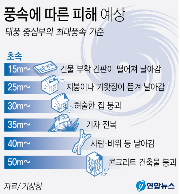 (영상 속 windy.com의) 색깔이 짙은 오렌지색 이상이면 30 kt 이상의 풍속이다.