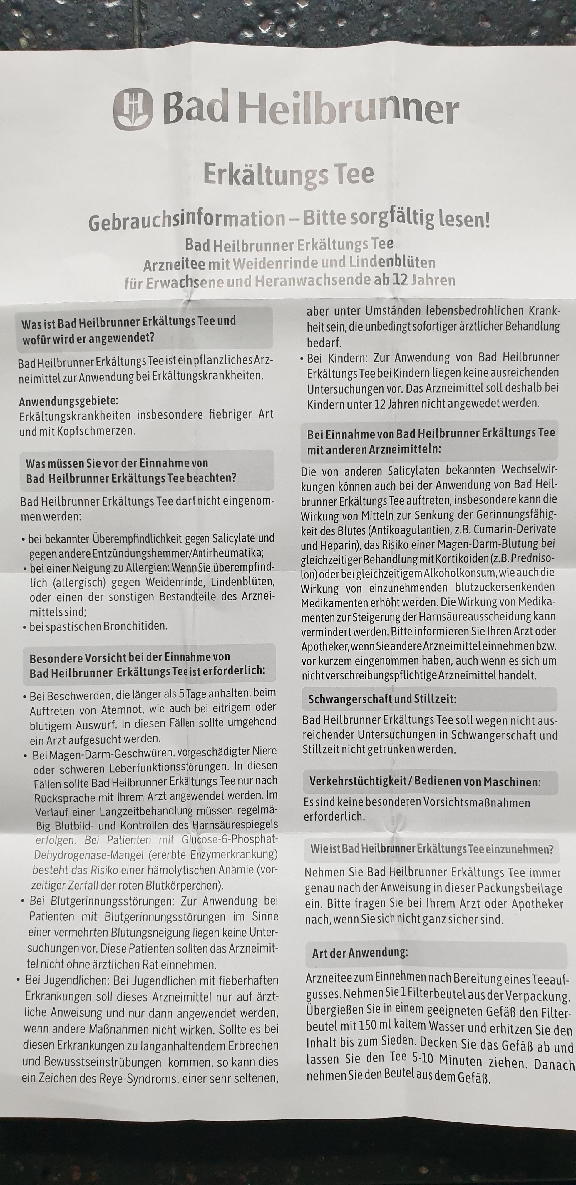달리 처방되지 않는 한, 성인과 12세 이상 청소년은 갓 준비한 따뜻한 차를 하루 5회 마십니다. 입맛에 맞게 달게 하세요. “바트 하일브루너 차가운 차를 마실 때 특별한 주의가 필요합니다”의 지침을 참고하세요.