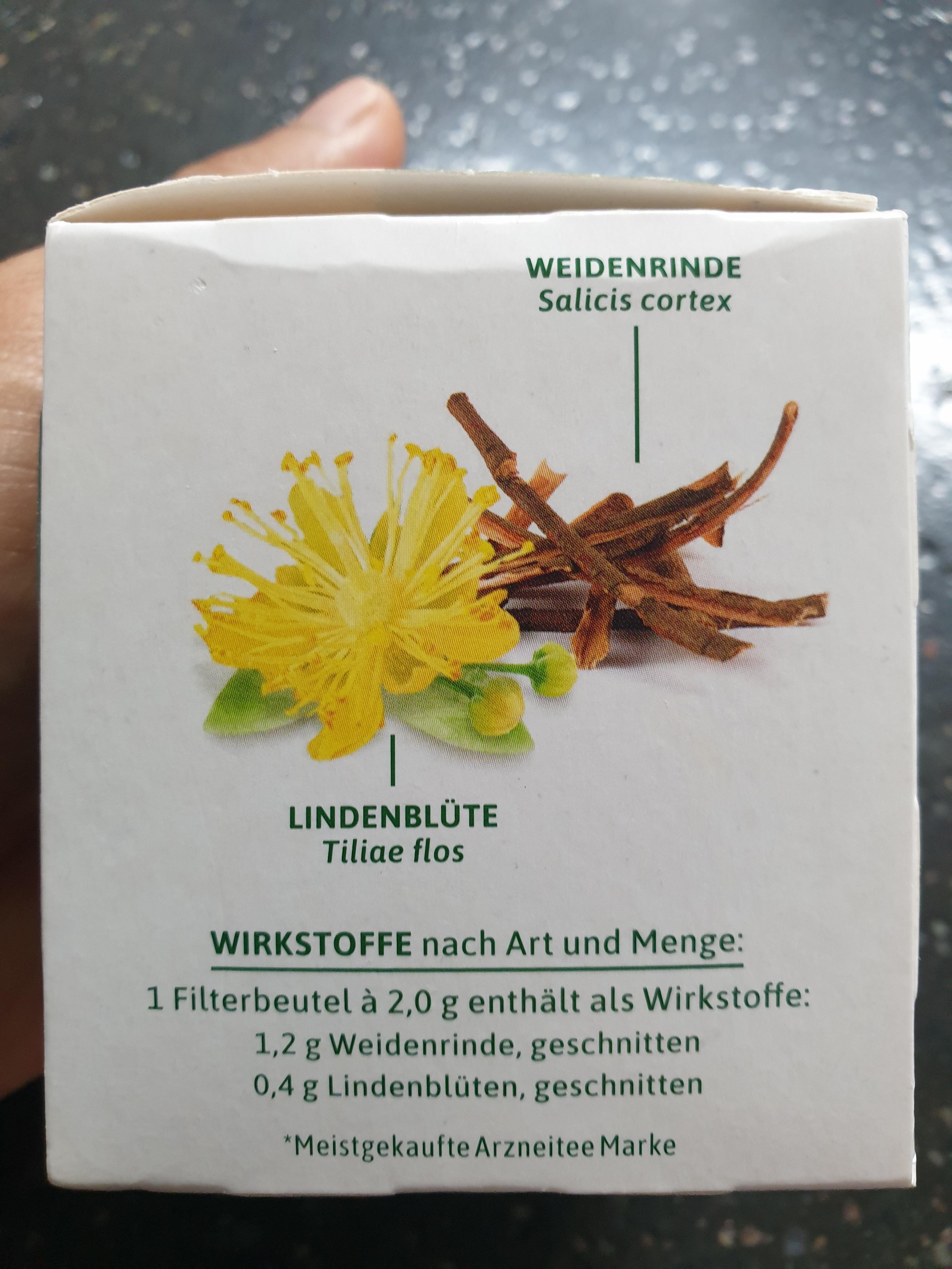 2.0g의 필터 백에는 활성 성분이 포함되어 있습니다: 버드나무 껍질 1.2g, 컷 라임 0.4g. 기타 성분: 감초 뿌리, 딱총나무 꽃, 메도우스위트 꽃, 양모 꽃, 페퍼민트 잎, 카모마일 꽃, 민들레 허브, 모란